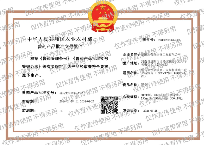 根据《兽药管理条例》和《兽药产品批准文号管理办法》的规定,经农业农村部审查,准予洛阳沃普森生物工程有限公司生产鸭传染性浆膜炎、大肠杆菌病二联灭活疫苗(1型CZ12株+O78型SH株),并核发兽药产品批准文号。